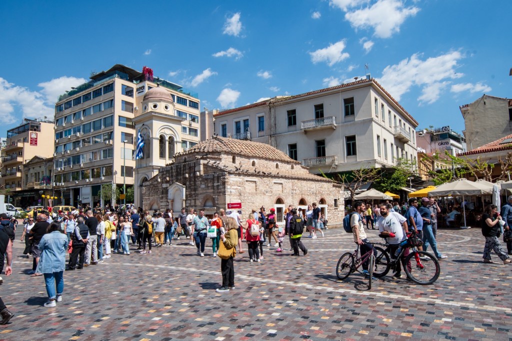 And so to the beating heart of the district – Monastiraki Square which, of course, is anything but square – more churches, food and wine, people and the Agora Flea market . . .